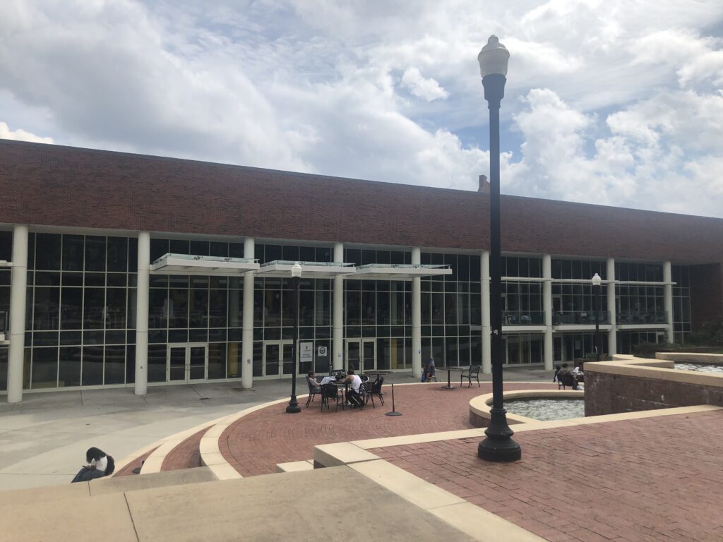 By the fountain, outside the cafe, UNCG students sit under the sky. Photo Credit: Melody Paguaga